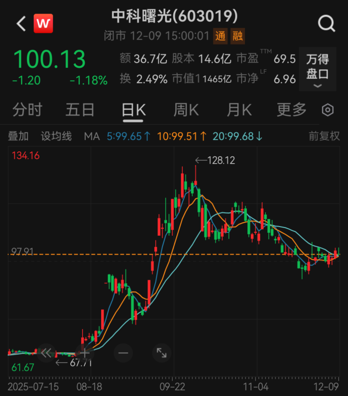 12月9日,中科曙光股价以100.13元/股报收,最新市值为1465亿元;海光信息股价以219.3元/股报收,最新市值为5097亿元。